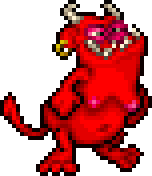 Bubba appears as a red demon with a small body and large head. Bubba moves around by jumping, stopping only to attack. He has two attacks: he will either spit a fireball at the player or spin like a tornado and dash after the player.