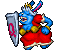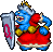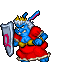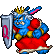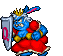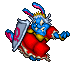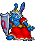 The Queen appears as a elderly, obese blue rabbit woman wearing a red dress and her royal crown on the head. During the fight with her she also carries a metallic shield with a large "Q" letter engraved on it.